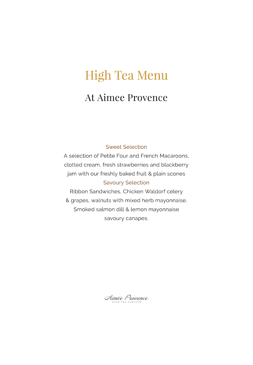 Aimee Provence High Tea Parlour offers a delightful selection of treats and beverages, perfect for any occasion. Their Macarons, including the indulgent Strawberries & Cream Macarons, are a standout, as are the various Teas such as True Calm, Earl Grey, and Persian Mint. For those looking for a special experience, their High Tea options like the Thursday Special, Mothers Day High Tea, and Gentleman’s High Tea provide a luxurious spread. Gluten-free options like the Devonshire Tea ensure that everyone can enjoy the delicious offerings. The restaurant also features a selection of Cakes like the seasonal Easter Butter Cream Cake, and a variety of Platters such as the Sandwich Platter and Dessert Box Platter. In addition, their Wines & Champagnes, including the exquisite Bottle Chandon, perfectly complement the food. For those in need of a gift, the Mothers Day Gift Box, Tea Set Gift Box, and other Gift Hampers make for thoughtful presents. Seasonal offerings like the Christmas Fruit Cake and Chocolate Truffles add a festive touch. Whether it's enjoying a relaxing afternoon with a Glass of Prosecco Pink or indulging in their special Scone Platters, Aimee Provence provides a memorable dining experience.