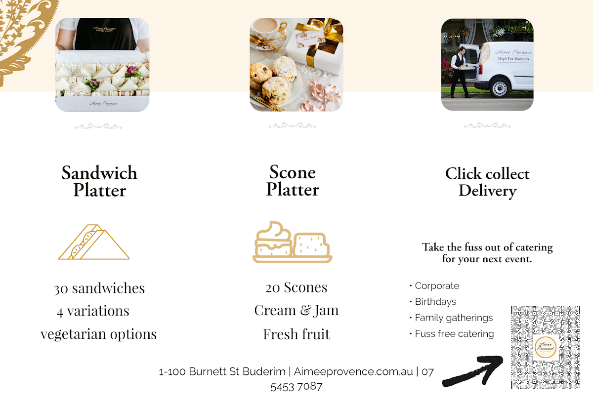 This Afternoon Tea Gift Box is perfect for one person, and contains everything needed to make your own delicious afternoon tea at home including a box of freshly prepared sandwiches, gourmet macarons, English breakfast tea room blend, petite fours and our delicious scones and jam preserve. The perfect gift for any occasion! Product Features: • Contains everything you need to make your own afternoon tea at home for one • Ideal as a housewarming gift, birthday gift or just because • Can be delivered within Buderim addresses • Available in either Classic or date Scones